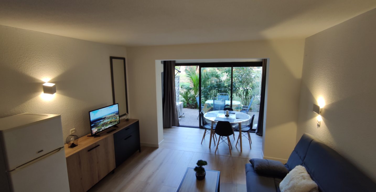 – Salon séjour équipé TV, coin repas avec table et chaises